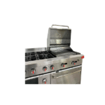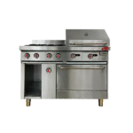 Cocina a gas de alto rendimiento y durabilidad, fabricada en acero inoxidable 430 frontal y respaldar, laterales elaborados en acero aluminizado, horno 33.000 BTU rango de temperatura del horno 80ºC a 250ºC, plancha o grill de 600 mm, 2 quemadores tubulares de 33.000 BTU, tapa en acero inoxidable con visor de temperatura y base.